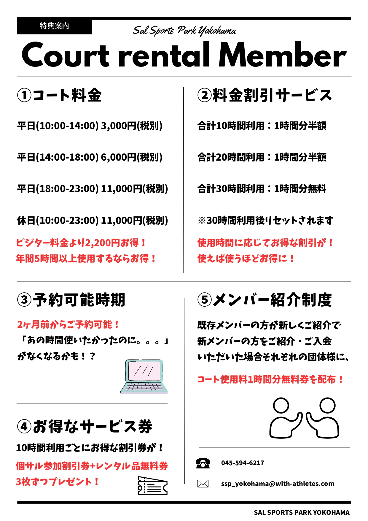 コートレンタルのご予約が1週間前にない場合、他のプログラムをご予約がない時間に開催する可能性がございます。
